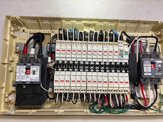 分電盤へ電線を通したら、専用の漏電ブレーカを設けて接続。
